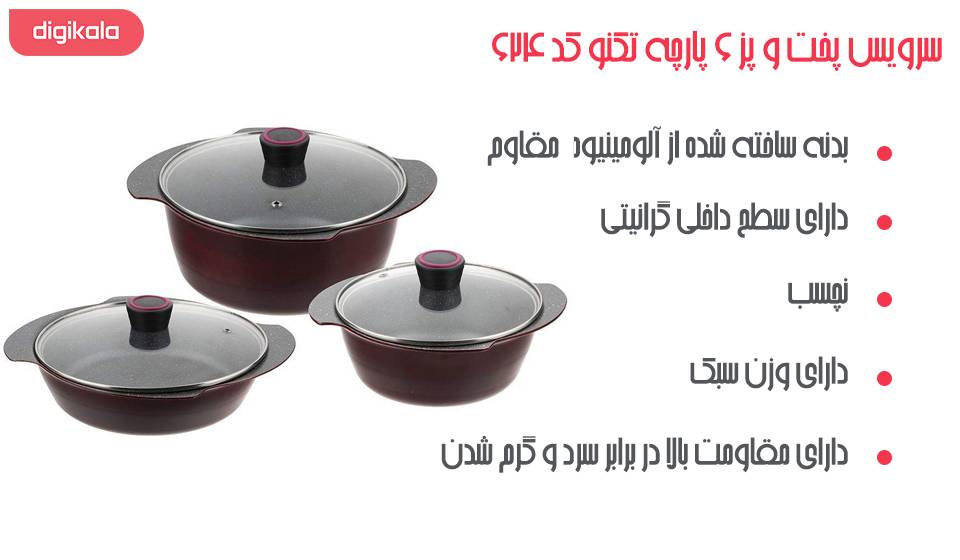سرویس پخت 6 پارچهی «تکنو» کد ۶۲۴ با داشتن ظروفی جمعوجور و اقلامی بسیار مختصر ولی کاربردی برای خانوادههای دو تا ششنفره مناسب خواهد بود. حتی اگر برای نوعروسان به دنبال یک سرویس پخت هستید که بهطور روزمره مورد استفاده واقع شود، این مدل را به شما پیشنهاد میکنیم. سرویس پخت تکنو از بدنهی آلومینیوم با روکش گرانیت ساخته شده است که امکان پخت غذایی سالم و بیضرر را برای خانواده فراهم میکند. فقط در رابطه با این ظروف باید نکتههایی را مدنظر داشته باشید که در نگهداری هرچهبهتر آنها به شما کمک میکنند. اولین نکته استفادهنکردن از قابلمهها و تابه روی حرارت بسیار زیاد، بدون وجود موادغذایی یا روغن است؛ زیرا باعث سوختن ظروف میشود. درپوشهای این سرویس از شیشه هستند و میتوانید در حین پخت غذا محتویات ظرف را هم ببینید.